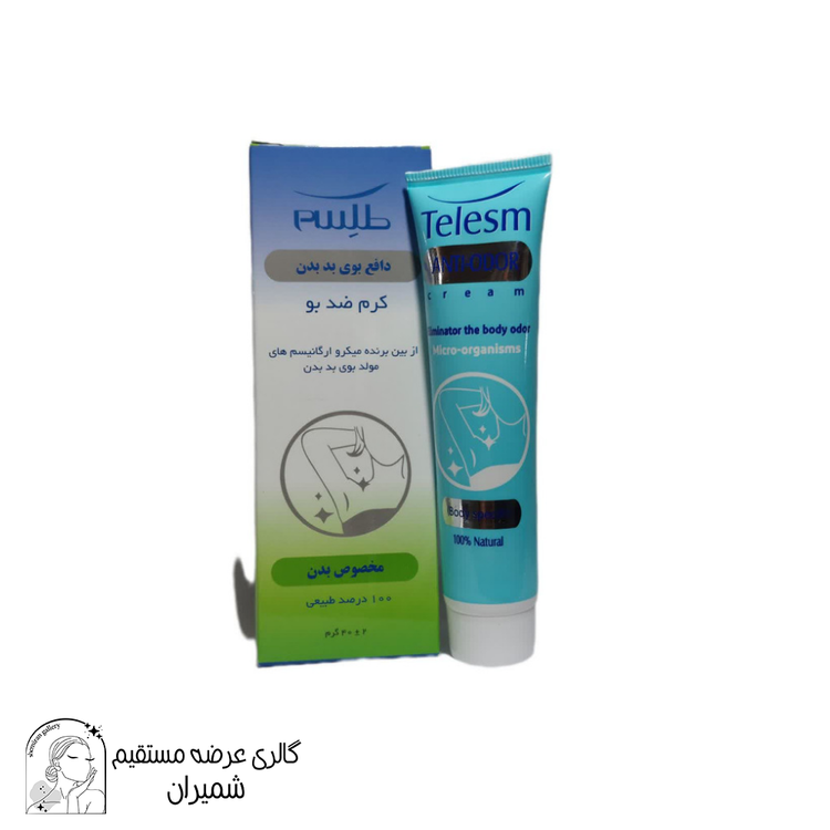 کرم ضد بوی بدن طلسم یکی از محصولات خوب و بادوام در دسته محصولات دافع بوی بدن است. این کرم کاملا گیاهی بوده و بدون مواد معطر و آروماتیک و فاقد عوارض جانبی و هرگونه مواد شیمیایی از قبیل آلومینیوم است. این کرم ضد تعریق نبوده بلکه متعادل کننده تعریق است چرا که عمل تعریق برای دفع سموم بدن ضروری است. این لوسیون سبب نرمی و لطافت زیربغل و از بین برنده تیرگی ناشی از اصلاح پوست است و تاثیری بر بافت و رنگ لباس نمیگذارد و دارای خاصیت ضد قارچ و ضدمیکروب است. استعمال این لوسیون تنها بعد از هر حمام کافی است و نیازی به استفاده مداوم از آن نیست. .