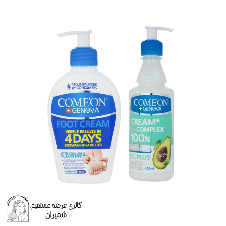 کرم مرطوب کننده کامان (comeon) مدل Oil pluse حجم 400 میلیلیتر + کرم رفع ترک پا مدل Shea butter حجم 300 میلیلیتر